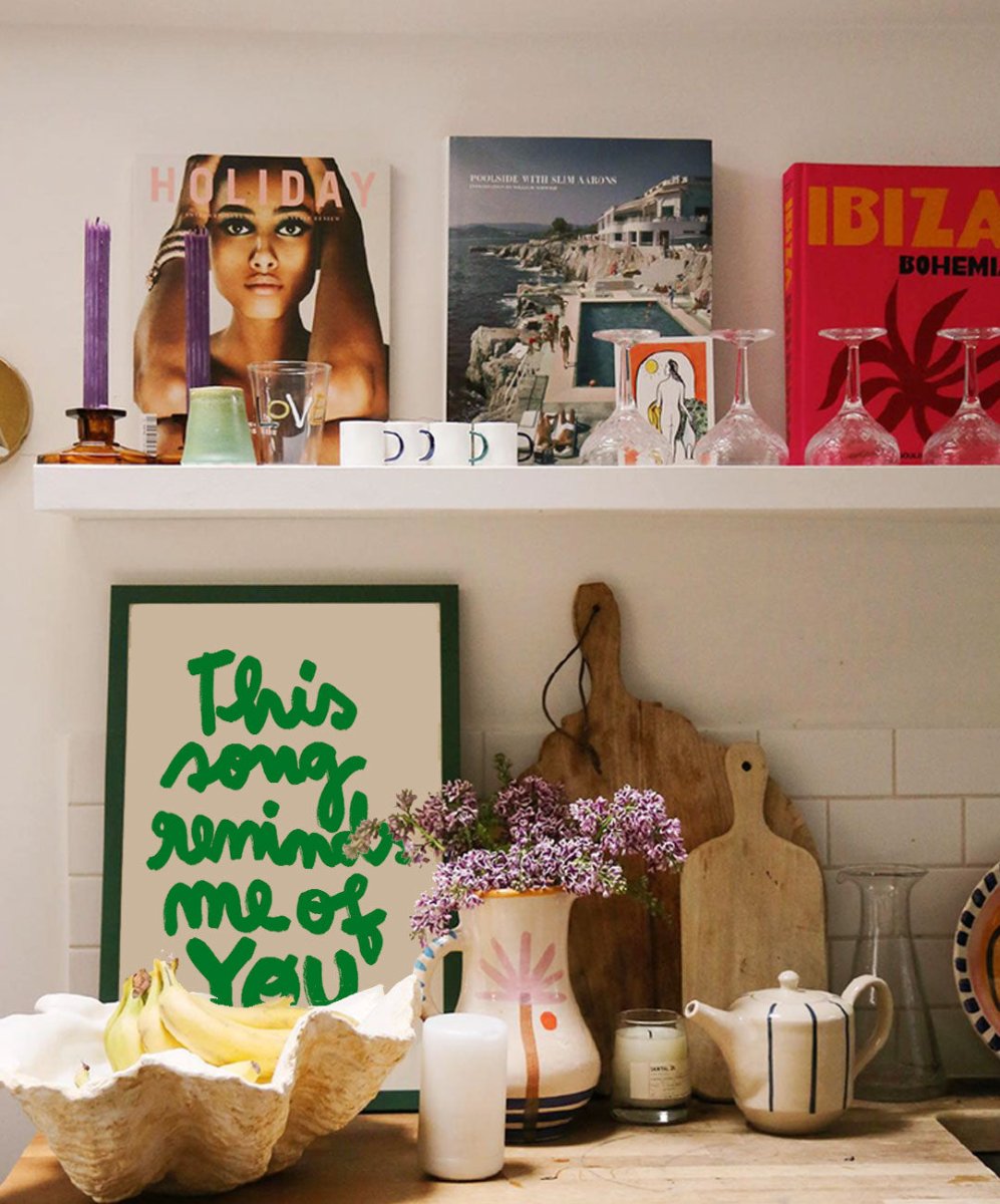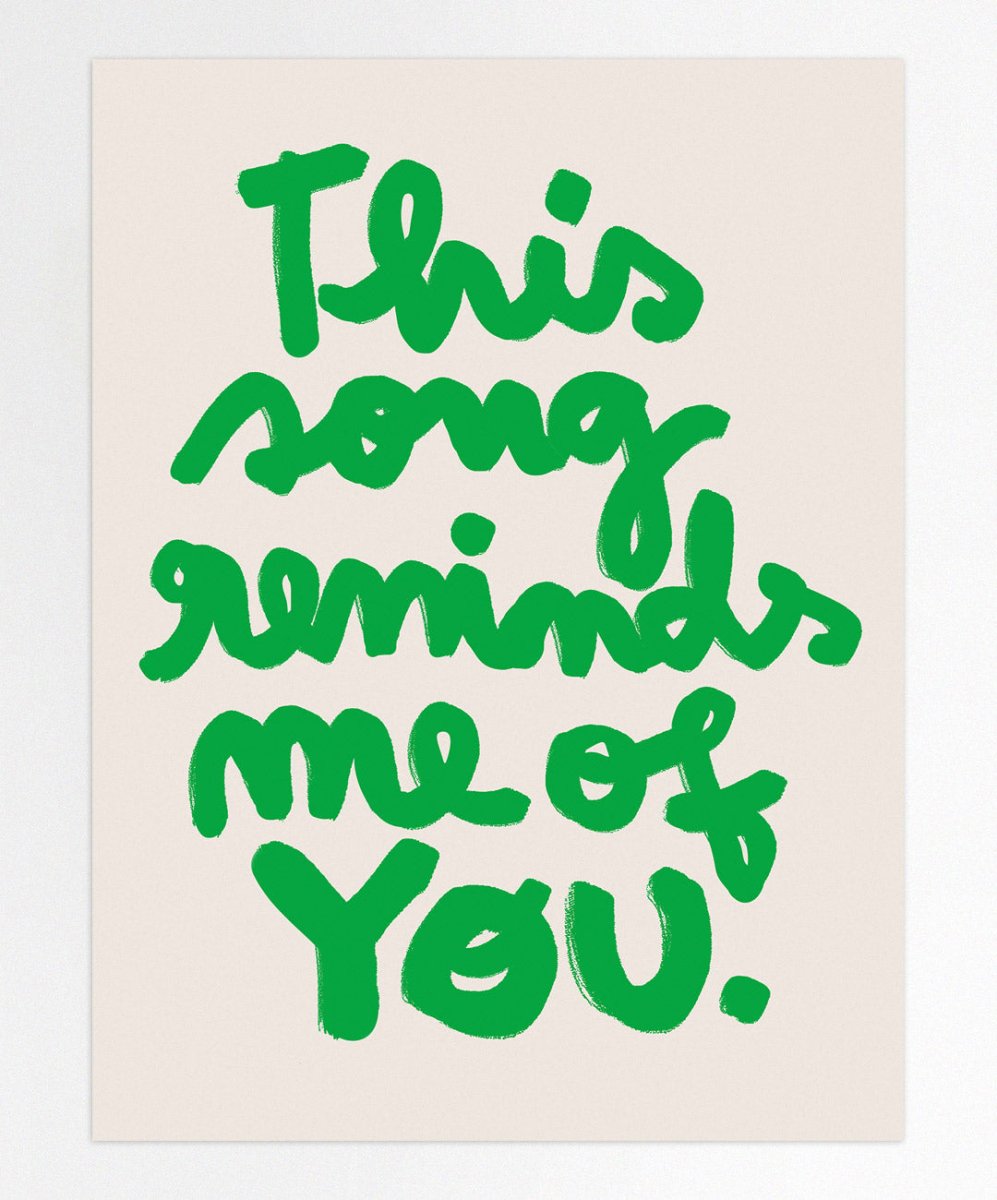 Let the music speak with the 'This song reminds me of you' poster from Catita Illustrations. Green letters, hand-painted style on a beige background, available in physical or digital formats, in 3 sizes. The ideal poster for those who associate songs with people. Perfect for surprising someone special!