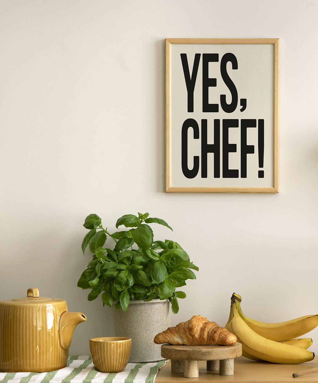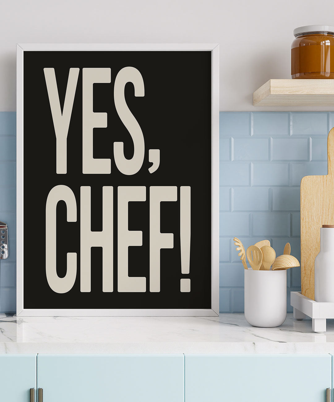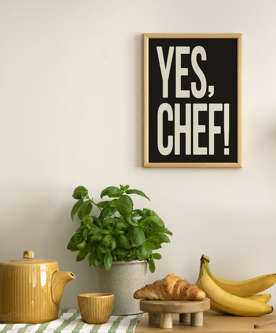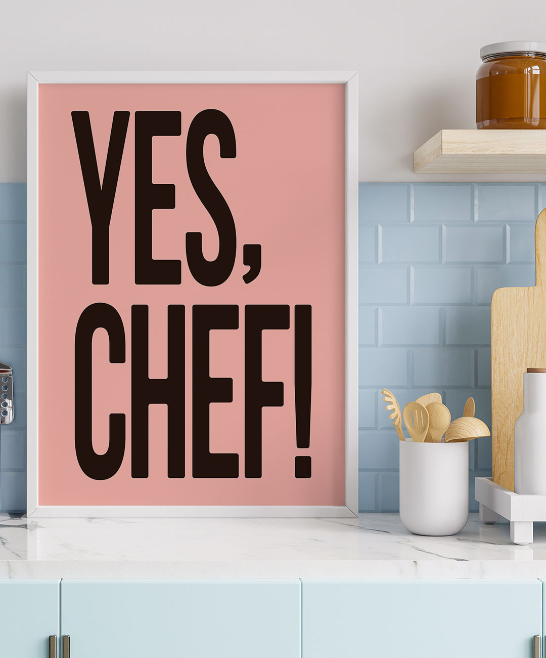 Yes, Chef!' is the poster that seasons any kitchen with humor. Choose from beige, black, or pink and add a touch of authority and style to your decor. Art with a dash of laughter. Available in digital or physical format and in various sizes, for chefs of all ranks.